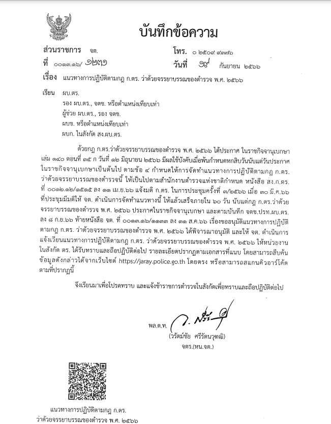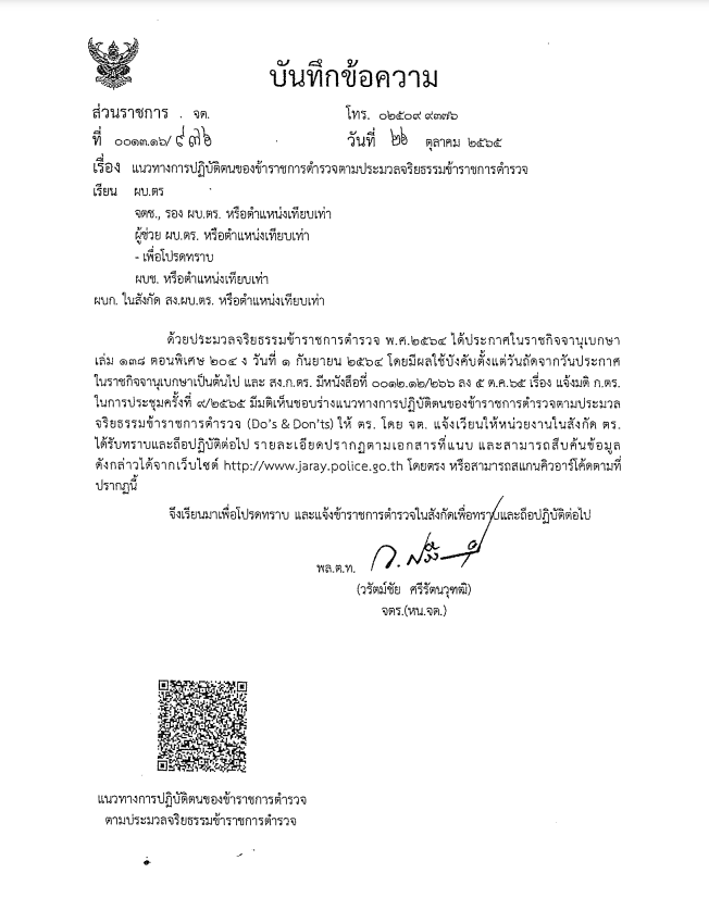 ดาวน์โหลดแนวทางการปฏิบัติตามกฎของ ก.ตร.ว่าด้วยจรรยาบรรของตำรวจ พ.ศ.2566คลิ๊กที่รูปภาพ